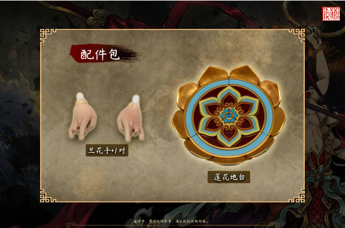 Fengshen-Neza is the newest member of FancyRealm's "Fengshen" action-figure series! This mythical hero faces every challenge with courage and cunning, and this figure is loaded with accessories to carry out all his adventures! This Deluxe Edition can be transformed into an impressive three-faced, six-armed figure! Additional accessories include a pair of lotus hands and a lotus-shaped base for display. A special preorder bonus available only with the first batch includes a pair of interchangeable hands, one transparent Qiankun ken, and a pair of Yin Yang swords in transparent red and transparent blue. (These items are only available with the first batch. If yours does not include these items, it was not part of the first batch.) Order yours today!