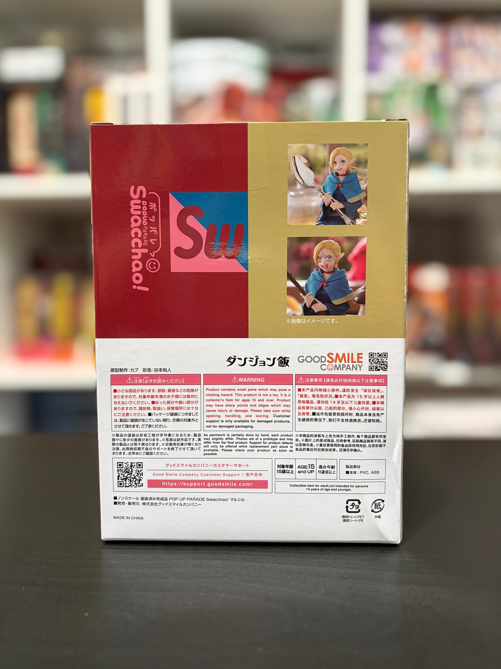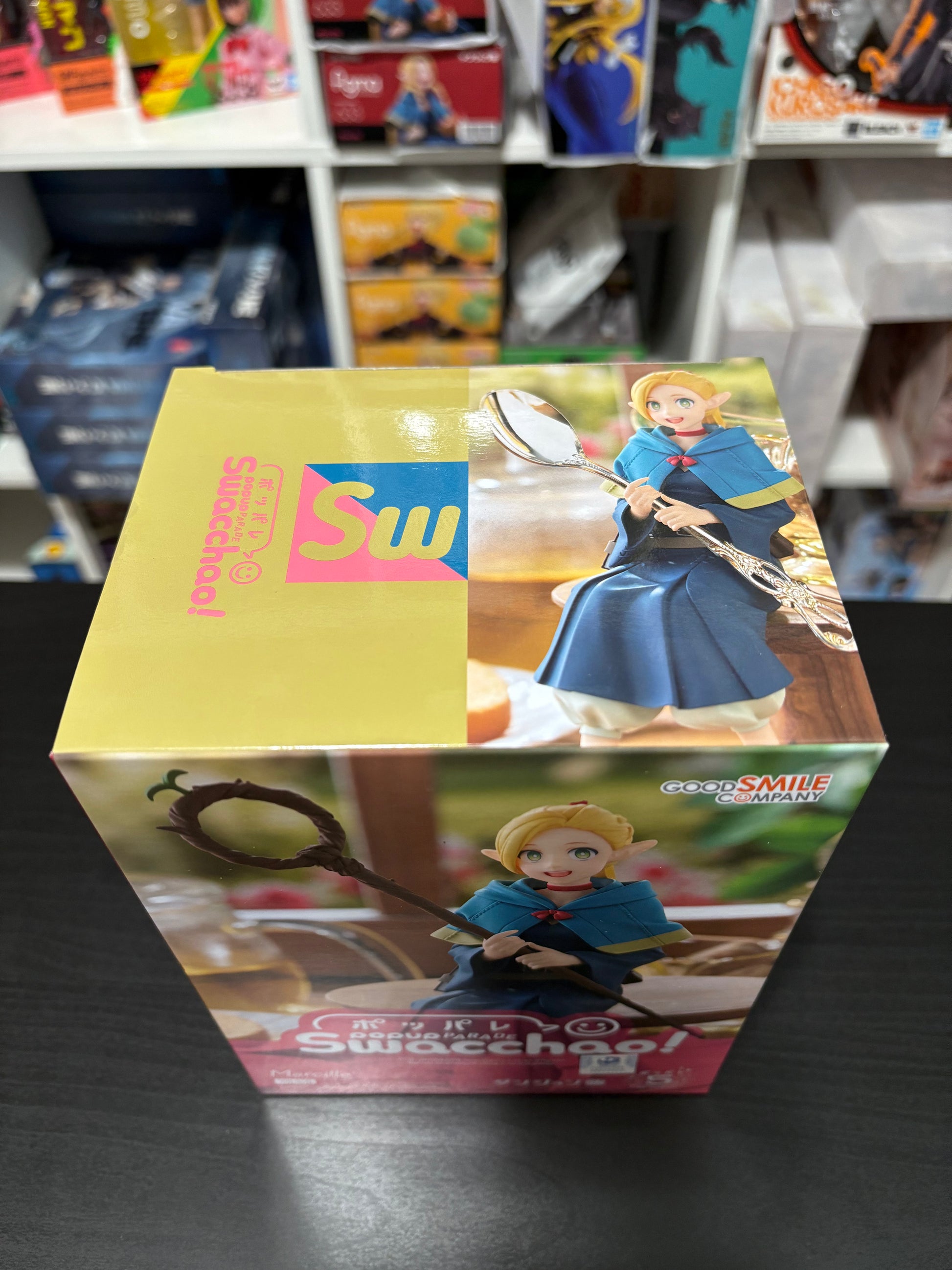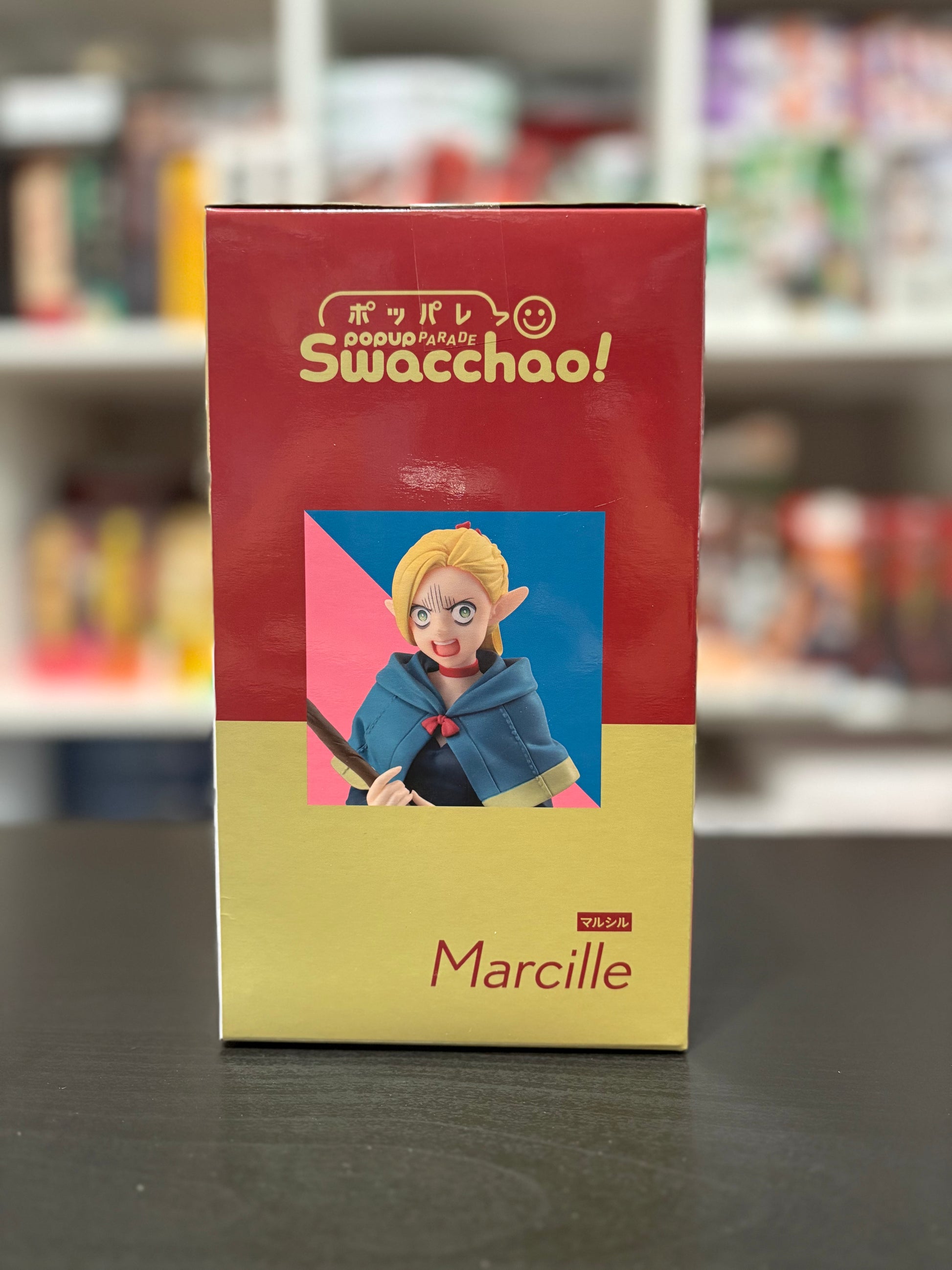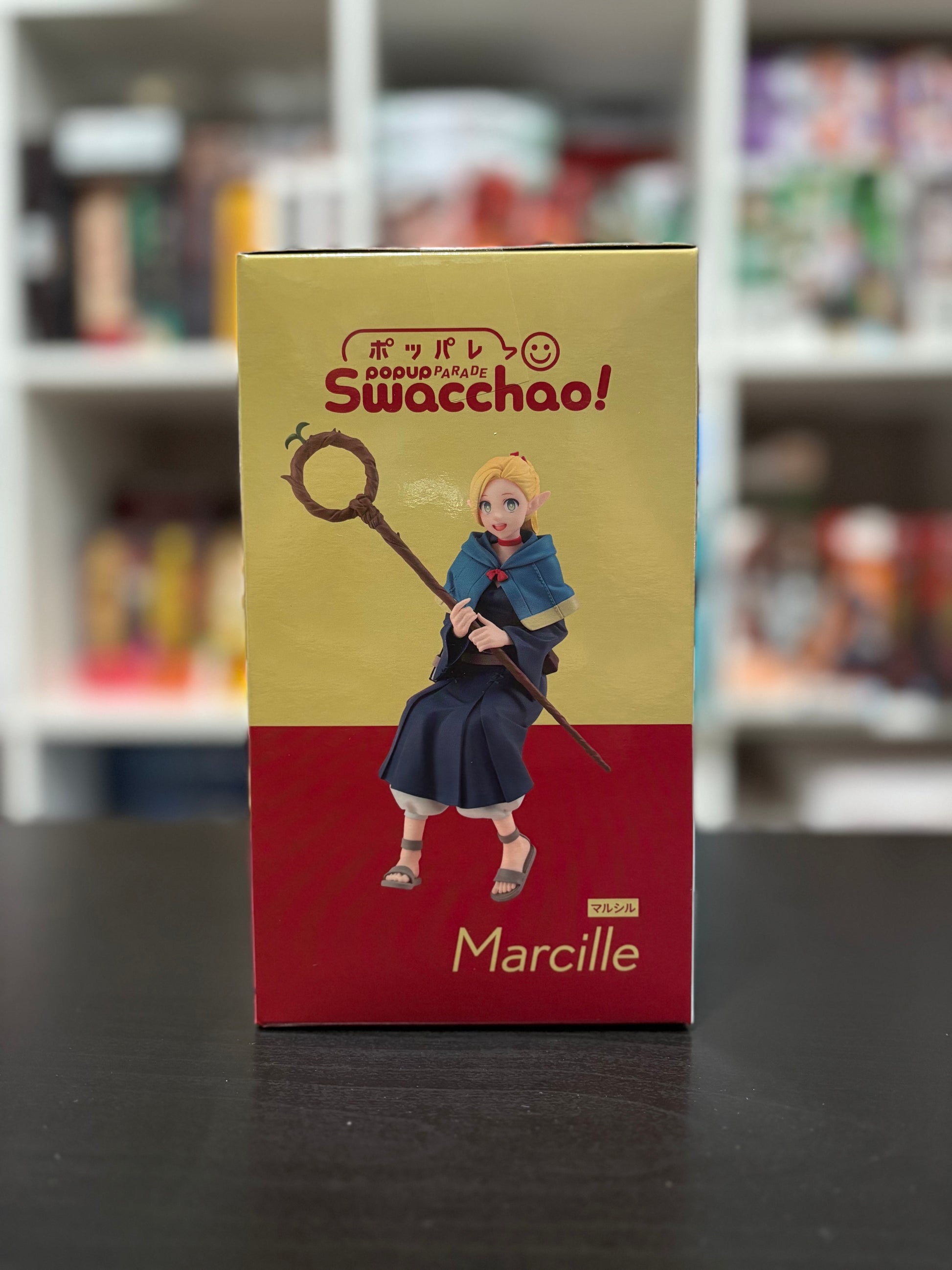 POP UP PARADE Swacchao! is a series of figures that can be displayed sitting in various places. The staff can be removed and replaced with other objects for Marcille to hold on to. Includes an interchangeable face plate of Marcille screaming "Nooo!"