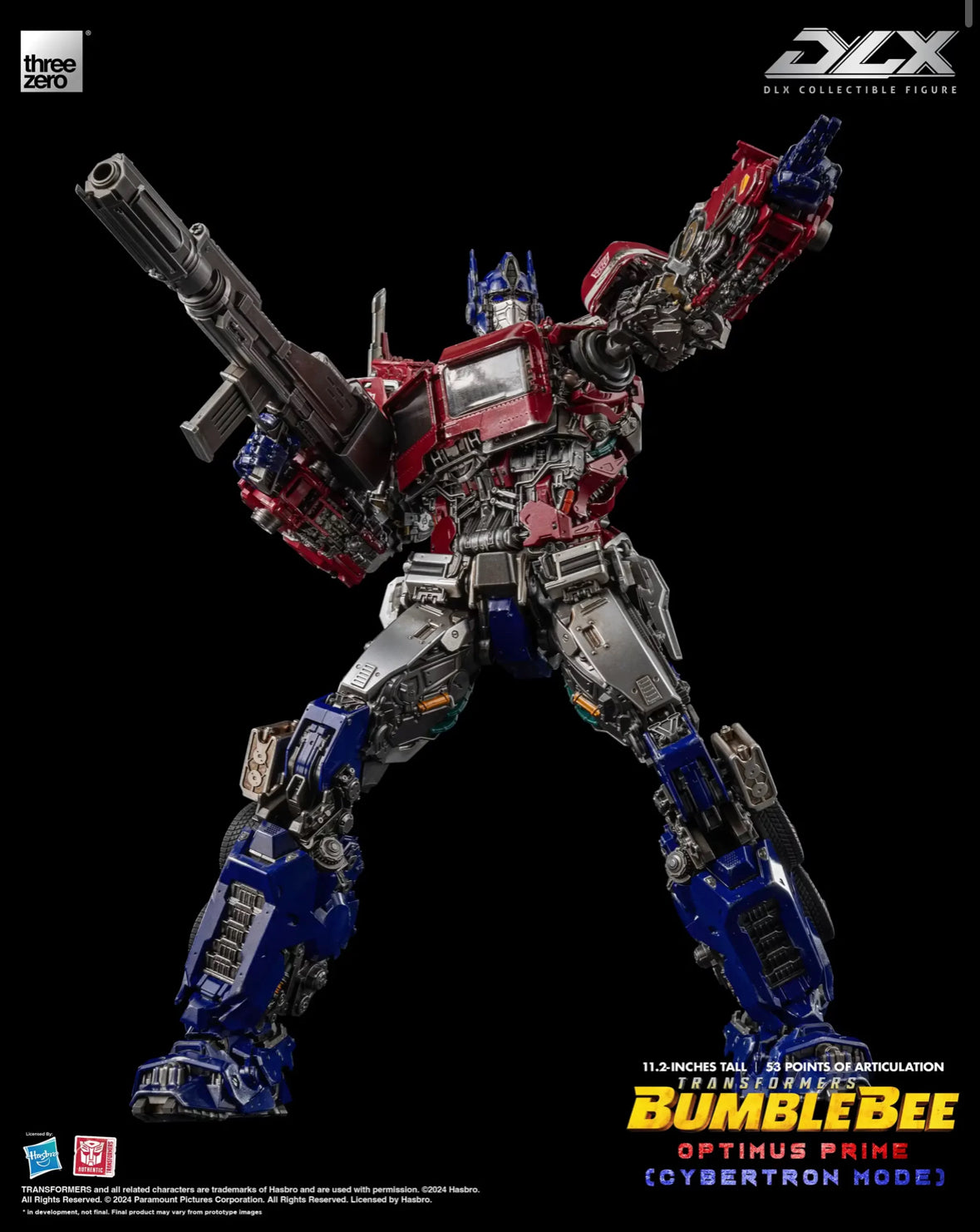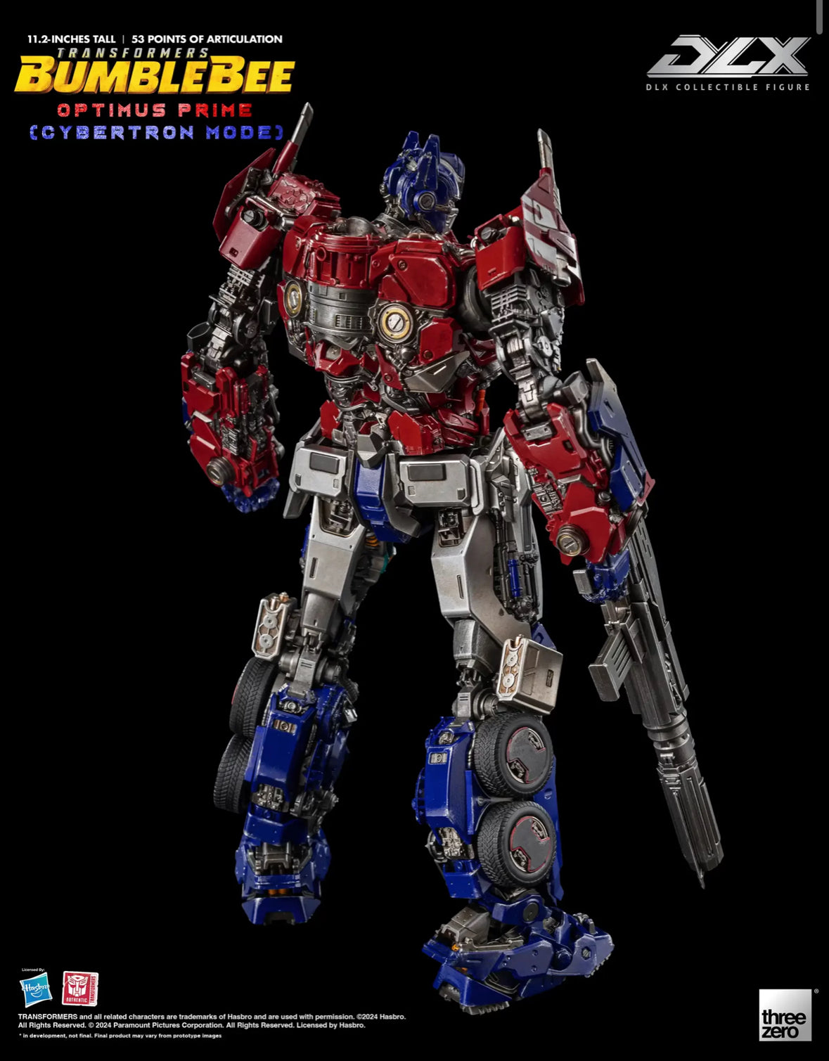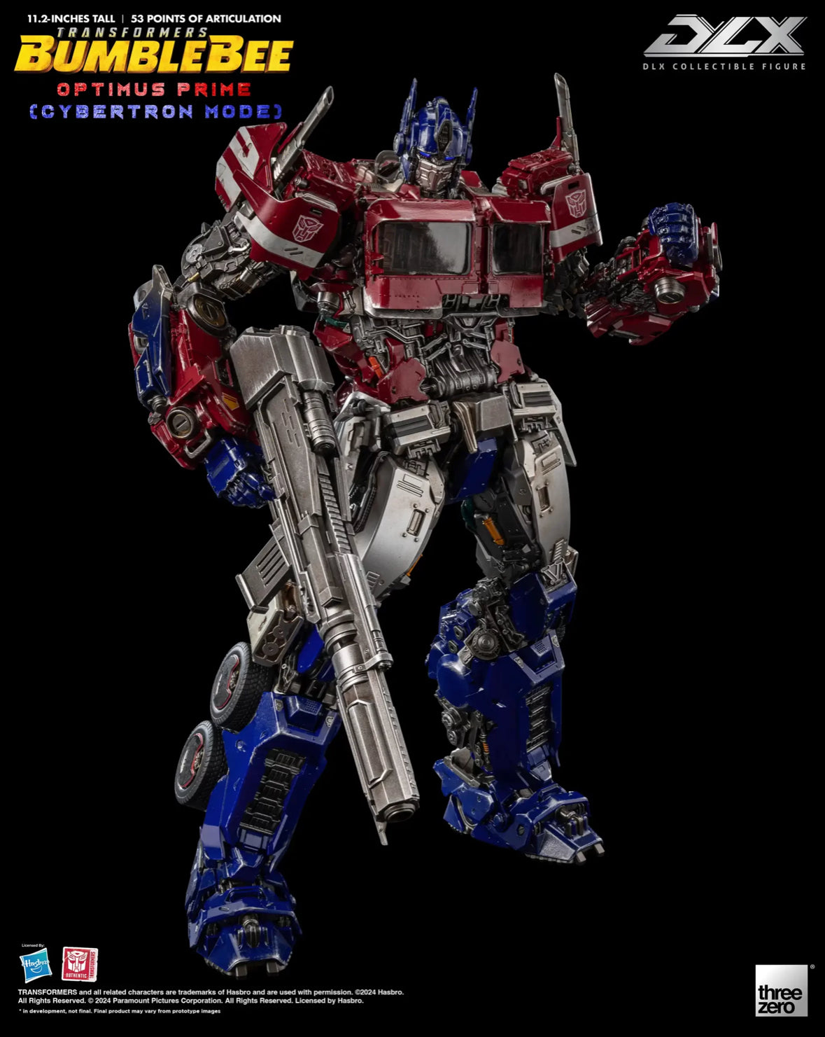 Standing approximately 11 2/5-inches tall, the Transformers: Bumblebee Optimus Prime Cybertron Mode DLX Action Figure is fully articulated with approximately 53 points of articulation. It features die-cast metal parts and engineering-grade plastics frame, which allows for a wide range of dynamic poseability, durability, and excellent stability. The non-detachable armor design of this figure depicts Optimus Prime's Cybertronian form. DLX Optimus Prime Cybertron Mode features a detailed sculpt and threezero's signature weathered paint application in order to replicate Optimus Prime's appearance as seen in the movie.